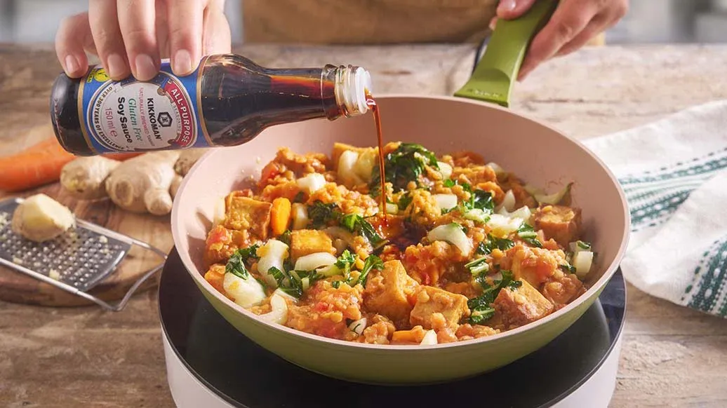 Un cremoso Dal di lenticchie rosse con zenzero e tofu croccante, insaporito con garam masala e Salsa di Soia Senza Glutine Kikkoman. Per dare vita ad un piatto completo, servilo con del riso fragrante saltato con aglio e scalogno.