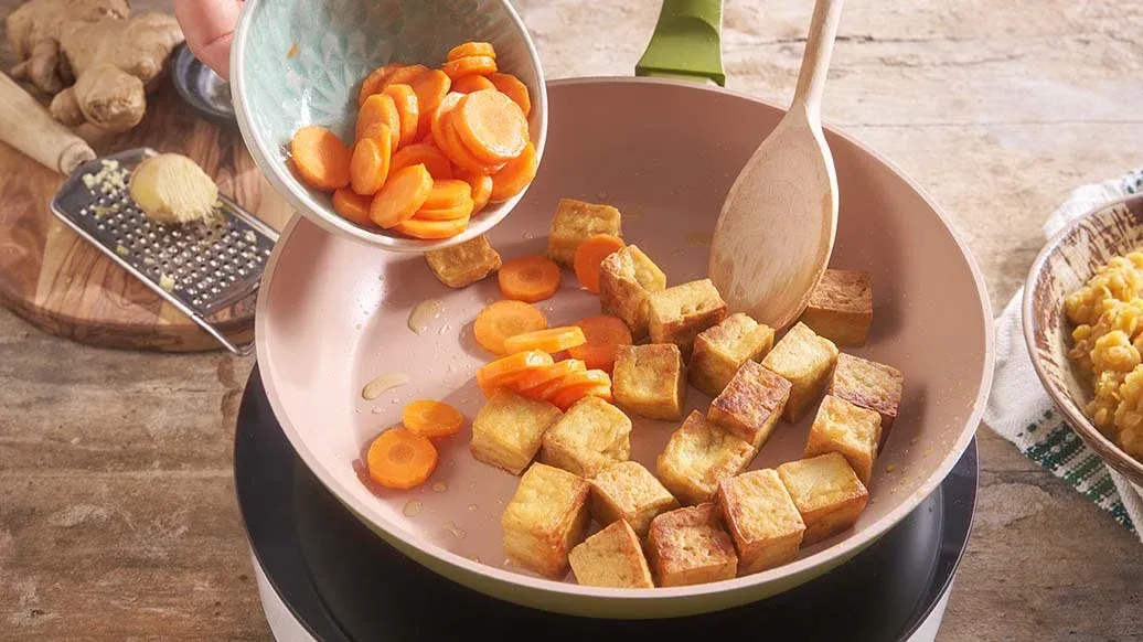 Cuoci le lenticchie nel brodo vegetale per 10 minuti. In una padella, friggi il tofu nel ghee per circa 4-5 minuti finché non diventa croccante. Aggiungi la carota e lo zenzero e friggi per 2 minuti.