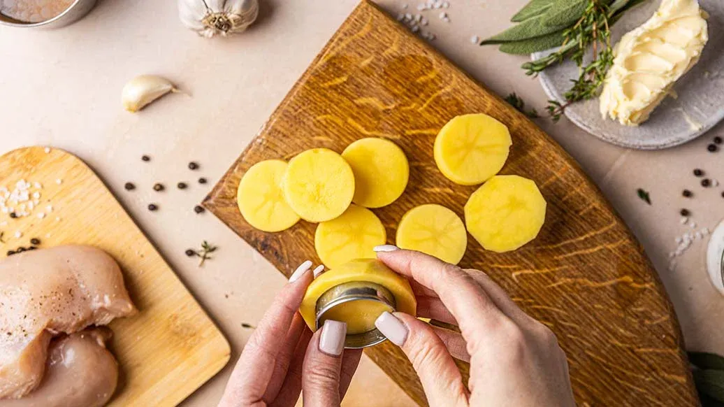 Sbuccia le patate e usa un coppapasta rotondo per modellarle in cilindri uniformi di 3 cm di spessore.