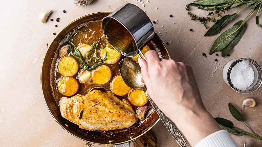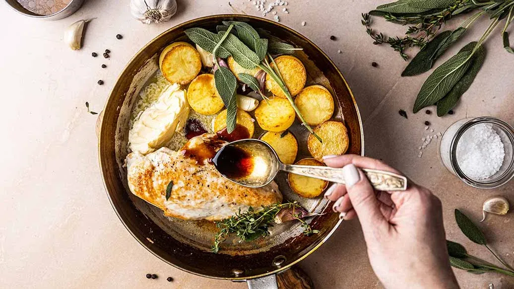 Scalda l'olio in una padella. Scotta le patate e il pollo su entrambi i lati fino a doratura. Aggiungi l'aglio schiacciato, il burro, la Salsa di Soia Kikkoman e le erbe aromatiche (timo e salvia). Scalda per 2 minuti, irrorando il pollo e le patate con la salsa e raschiando i pezzi più saporiti dal fondo della padella.