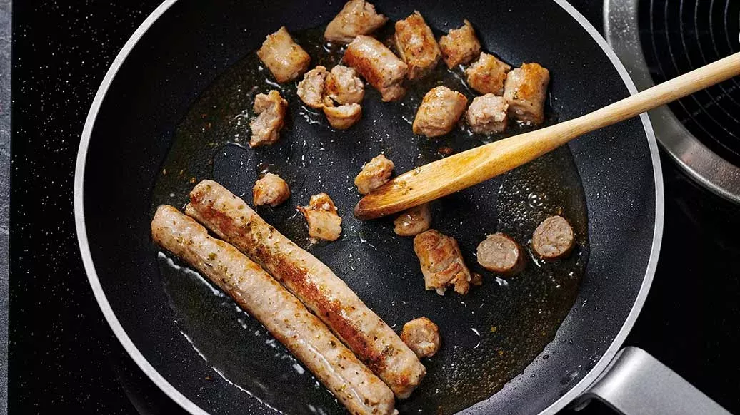 Tagliare la salsiccia, togliere la carne e gettare la pelle. Scaldare per bene l’olio in una padella grande a bordo alto. Far soffriggere la salsiccia all’interno per 8-10 minuti e dividerla a pezzetti con il retro di un mestolo di legno. Una volta giunta a doratura, mettere la salsiccia in un piatto e lasciare da parte.