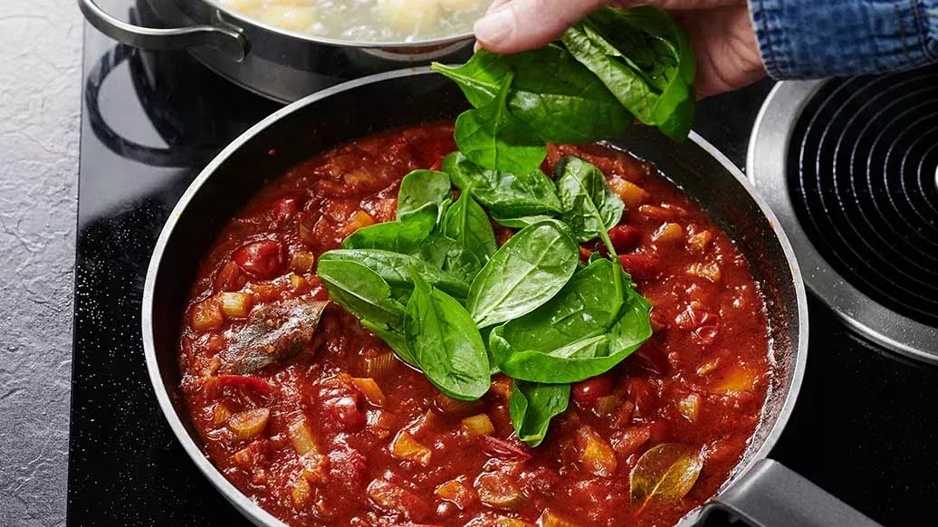 Gnocchi piccanti con pomodori e salsiccia, finocchio e spinaci
