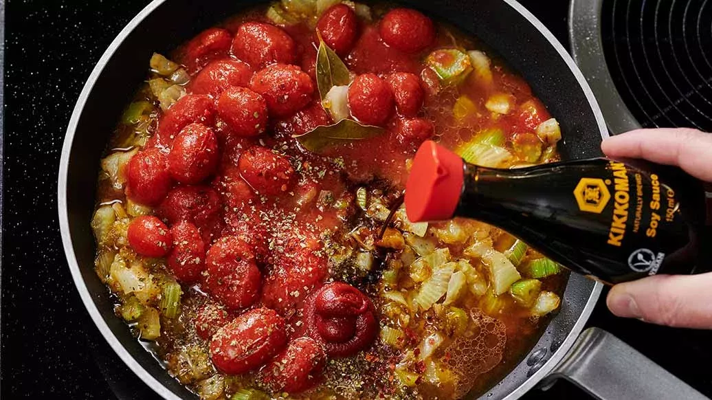 Mettere nella padella cipolla e finocchio e far rosolare per 10 minuti, fino a farli ammorbidire. Aggiungere l’aglio e proseguire la cottura per 1 minuto, unire poi i pomodori con 200 ml d’acqua, il peperoncino a fiocchi, l’origano, le foglie d’alloro, il concentrato di pomodoro e la salsa di soia. Far ridurre leggermente e a fuoco basso per 20 minuti e condire a piacere.