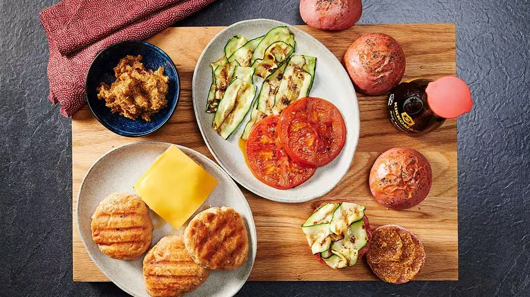 Succosi hamburger di salmone alla griglia, con pomodori e zucchine grigliati e mostarda di fichi. I bellissimi panini per hamburger fatti in casa sono colorati naturalmente con barbabietola rossa e curcuma gialla!