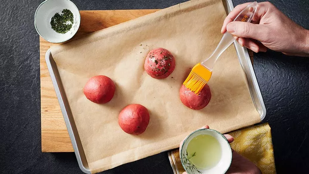 Formare con l'impasto 4 panini per hamburger piatti e lasciare lievitare per altri 20 minuti. Preriscaldare il forno a 200 °C (180 °C, se ventilato). Spennellare i panini per hamburger con l'albume, cospargere con un po’ di timo e cuocere in forno per circa 15-20 minuti. Lasciarli raffreddare.