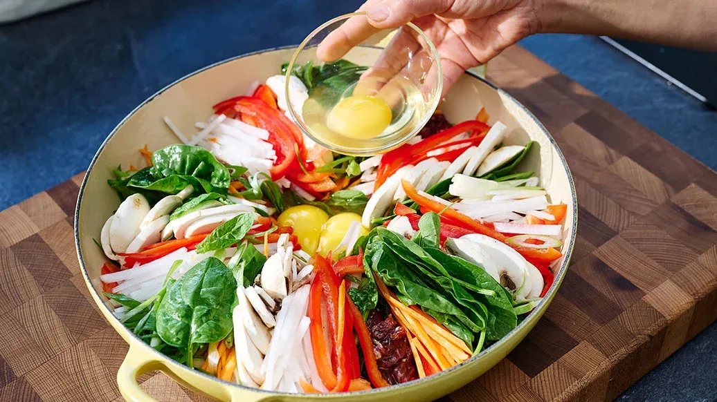 Rompi le uova negli spazi al centro della pentola. Poni la pentola a fuoco medio e versa l’acqua uniformemente intorno agli ingredienti. Quando le uova e le verdure sono cotte, mescola delicatamente per amalgamare e servi subito.