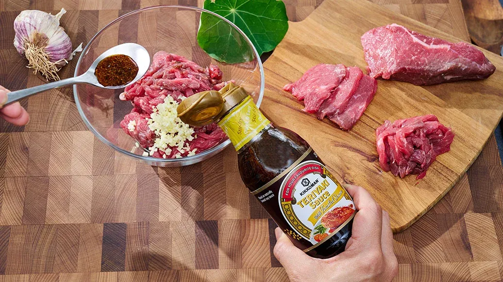 300 g di fettine sottili di manzo o maiale (anche carne macinata di manzo o tofu sono adatti) – 1 spicchio d’aglio grattugiato – 120 ml Salsa Teriyaki con Sesamo Tostato Kikkoman