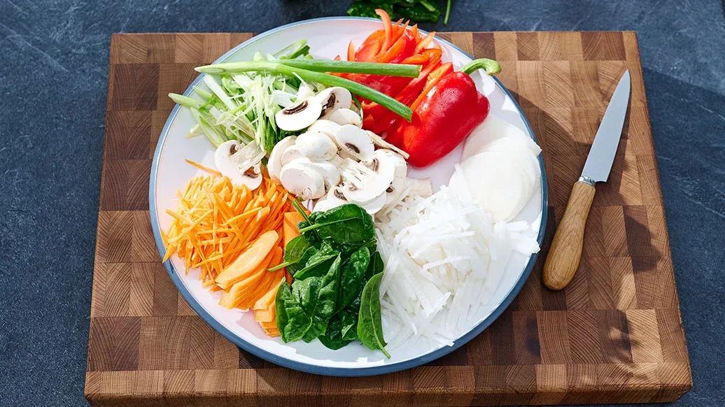 Taglia alla julienne il daikon e le carote, in strisce sottili lunghe circa 6 cm. Taglia cipollotti, spinaci e peperone a pezzi di 6 cm. Affetta i funghi a fette spesse circa 5 mm.
