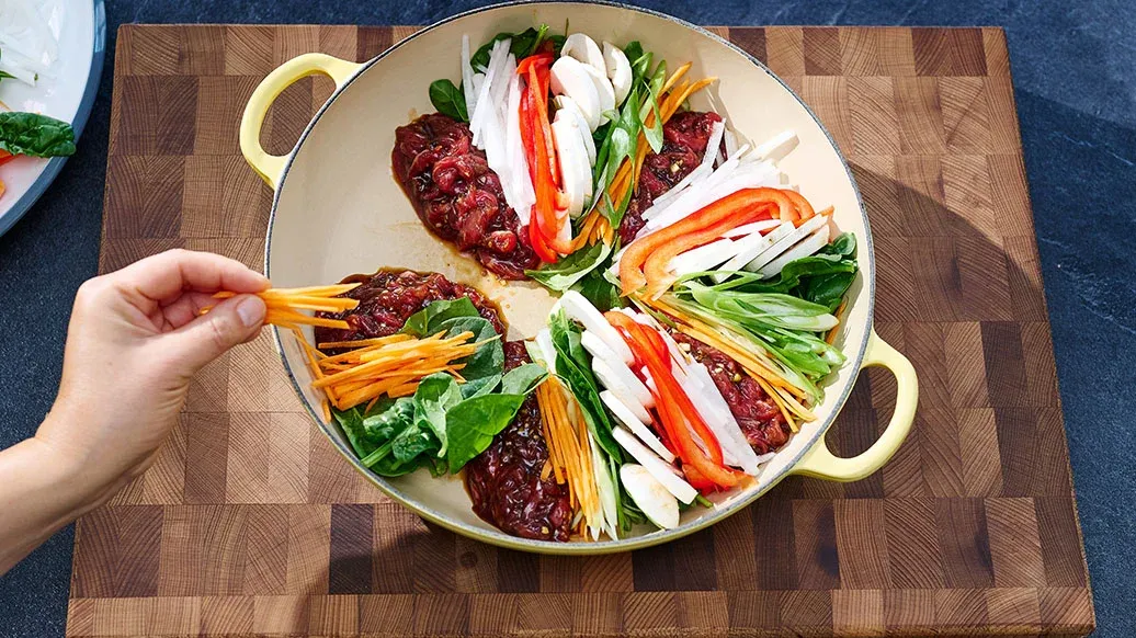 Versa l’Olio di Sesamo Kikkoman in una pentola. Dividi la carne marinata del Passaggio 1 in 5 porzioni e disponile a cerchio, lasciando degli spazi tra una e l’altra. Disponi le verdure del Passaggio 2 in modo uniforme intorno alla carne, seguendo lo stesso schema circolare.