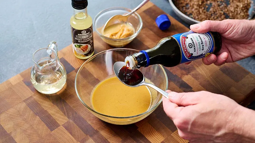 1 cucchiaino di pasta di miso – 2 cucchiai di aceto di mele – 2 cucchiaini di olio di semi di lino – 2 cucchiaini Salsa di Soia Tamari a Fermentazione Naturale Senza Glutine Kikkoman – 1 cucchiaino Condimento Dolce da Cucina in Stile Mirin Kikkoman – Pepe macinato fresco – 2 cucchiaini di semi di lino (eventualmente pestati) – 2 cucchiai di acqua