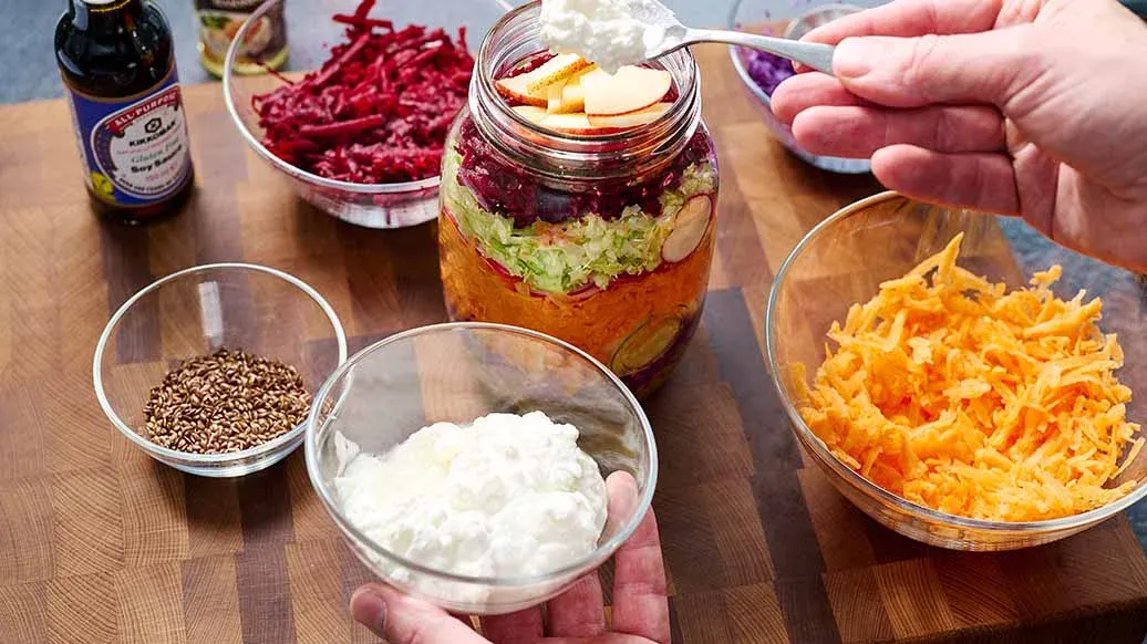 Componi l'insalata a strati in un barattolo di vetro alto nel seguente ordine: condimento, cavolo rosso, mela, carota, ravanello, cavolo cappuccio, barbabietola, pera, fiocchi di latte e semi di lino. Chiudi il barattolo e agita brevemente prima di servire, così da distribuire il condimento in modo uniforme. In alternativa, servi l'insalata in ciotole.