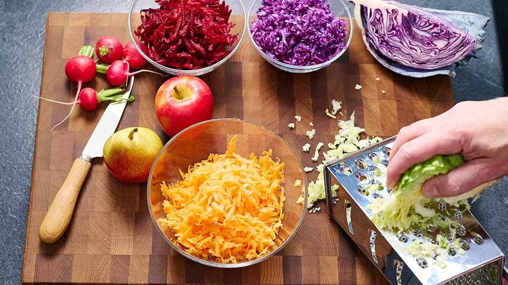 Grattugia grossolanamente e separatamente il cavolo cappuccio, il cavolo rosso, la barbabietola e le carote. Affetta i ravanelli, e taglia la mela e la pera prima a spicchi e poi a fettine.