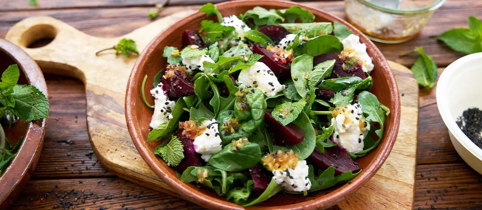 Tagliare la barbabietola arrosto a spicchi e disporla su un piatto. Sbriciolare la ricotta sopra, quindi distribuire la rucola e gli spinaci. Versare il condimento, guarnire con le foglie di menta e spolverare con i semi di sesamo.
