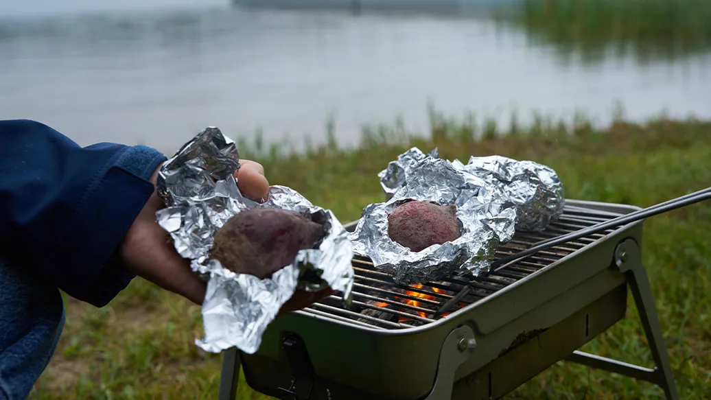 Lavare le barbabietole, avvolgerle in carta stagnola e arrostirle per 45–50 minuti sul barbecue fino a quando non diventeranno tenere, oppure in forno a 180–200°C.