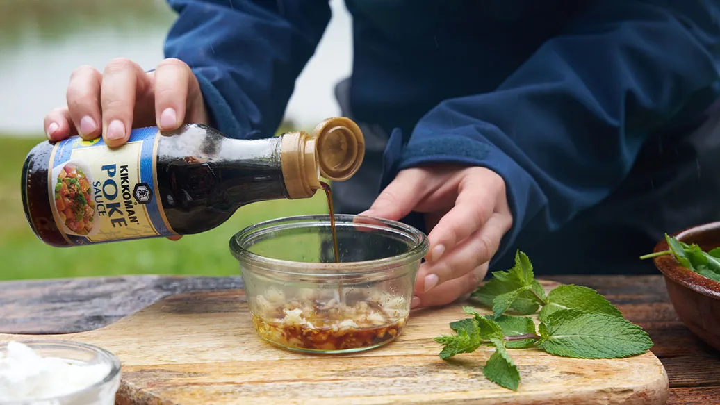 Tritare finemente lo zenzero e l’aglio, quindi unirli alla Salsa Poke Kikkoman e al miele per preparare il condimento.