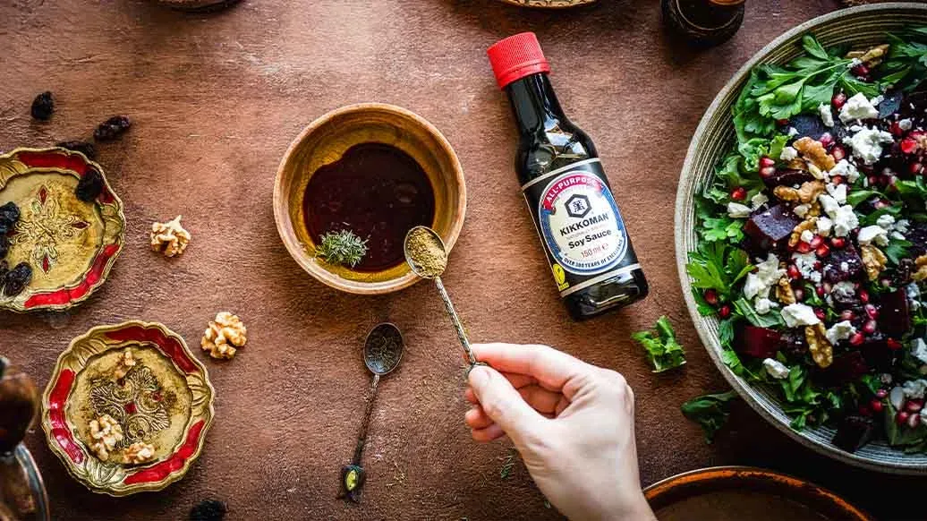 1 cucchiaio di olio d'oliva – 2 cucchiai Salsa di Soia a Fermentazione Naturale Kikkoman – 1 cucchiaio di sciroppo d'agave – 1 cucchiaio di succo di limone – 1 cucchiaino di timo secco – 1 cucchiaino di cumino in polvere