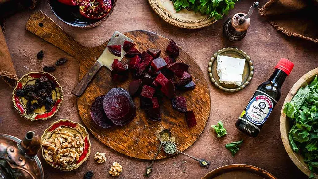 Porta un tocco di colore in tavola con questa vivace insalata di ispirazione mediorientale. Unisce barbabietole arrosto, cavolo riccio, uvetta dolce e chicchi di melograno. Il tutto è completato da noci, feta e un condimento al timo e salsa di soia.