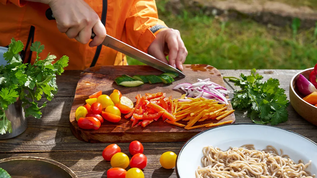 Cuocere i soba noodles seguendo le istruzioni sulla confezione, quindi sciacquarli sotto acqua fredda e scolarli. Pelare la carota. Poi tagliare carota, cetriolo e peperone rosso in sottili bastoncini (lunghi circa 5 cm). Affettare la cipolla a spicchi sottili.