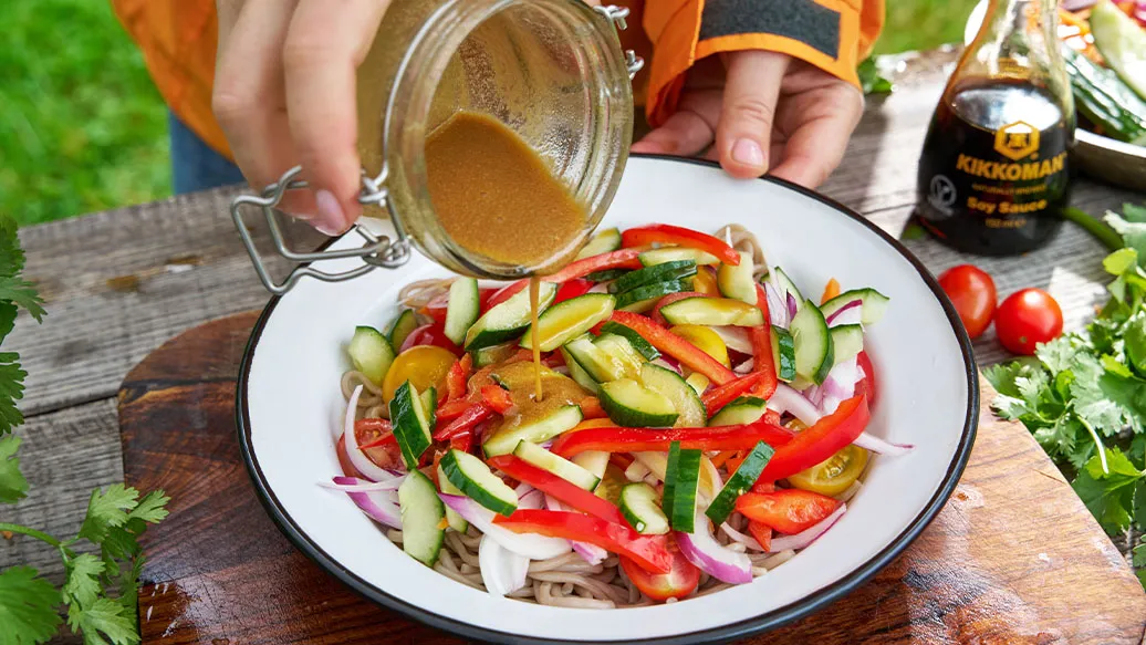 Soba noodles con verdure croccanti e un condimento aromatico a base di Salsa di Soia Kikkoman e tahina—un’insalata leggera e rinfrescante, ideale per il pranzo ma anche per uno spuntino.