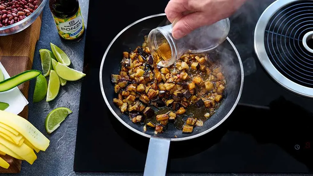 Taglia la melanzana e lo scalogno a cubetti piccoli e trita l'aglio. Scalda 1 cucchiaio di olio d'oliva e soffriggi la melanzana, lo scalogno e l'aglio finché non saranno dorati. Sfuma con l'aceto e la Ponzu al Limone Kikkoman. Incorpora l'olio di semi di lino e condisci con il pepe.