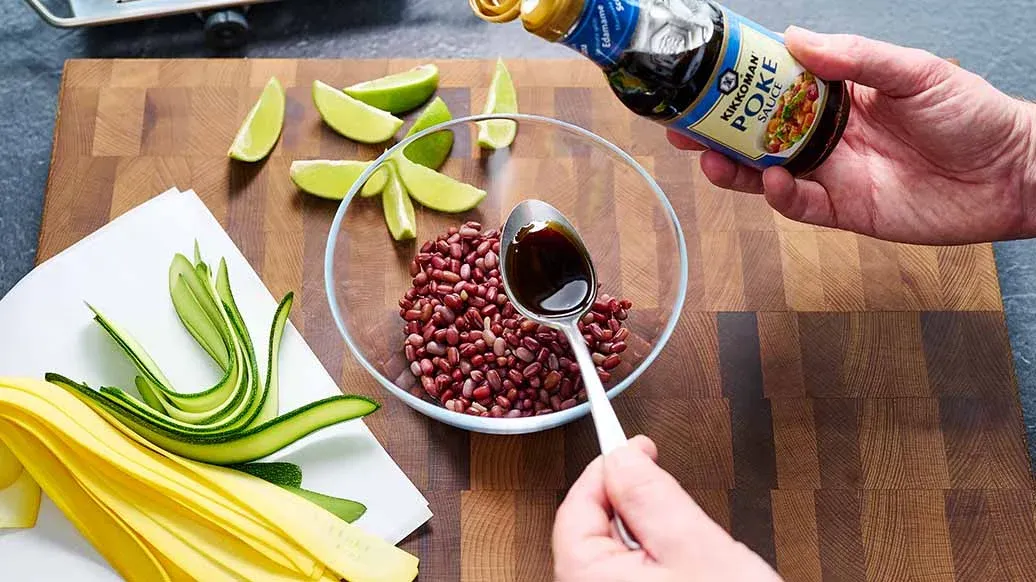 Taglia le zucchine sul lato lungo, a fette o a listarelle. Marina i fagioli azuki nella Salsa Poke Kikkoman. Taglia il lime in otto spicchi.