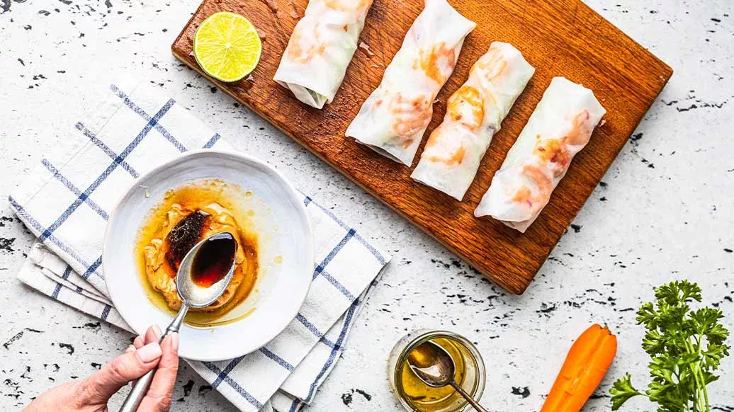 Involtini estivi con verdure, gamberetti e salsa di arachidi