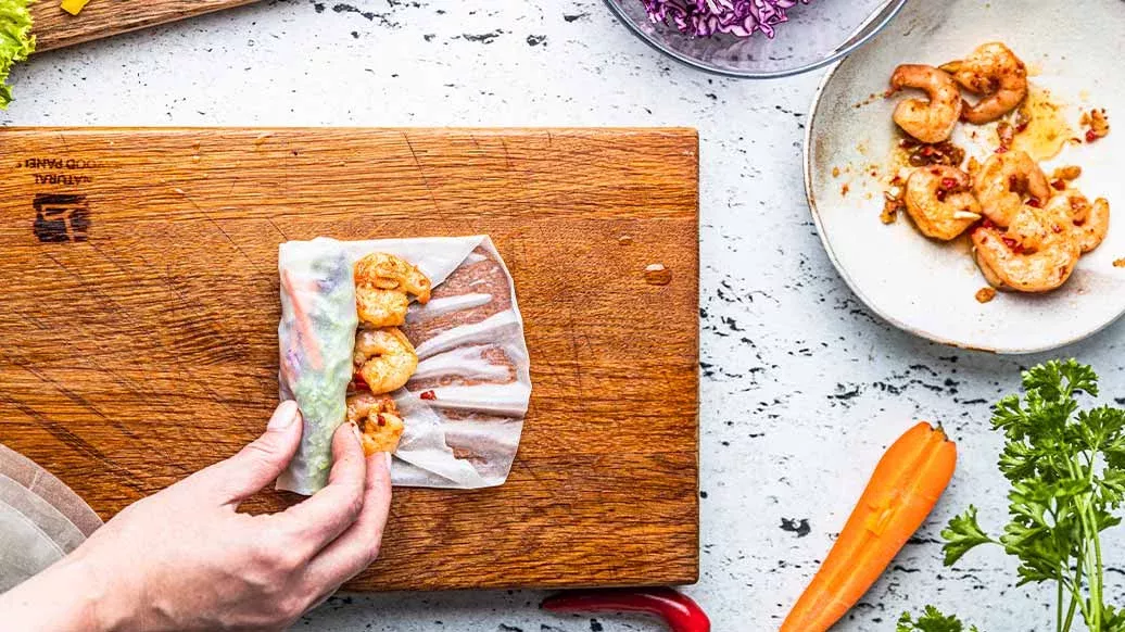 Inumidire la carta di riso in acqua tiepida. Riempire con le verdure e iniziare ad arrotolare. Prima di avvolgerlo completamente, aggiungere i gamberetti e finire di arrotolare.