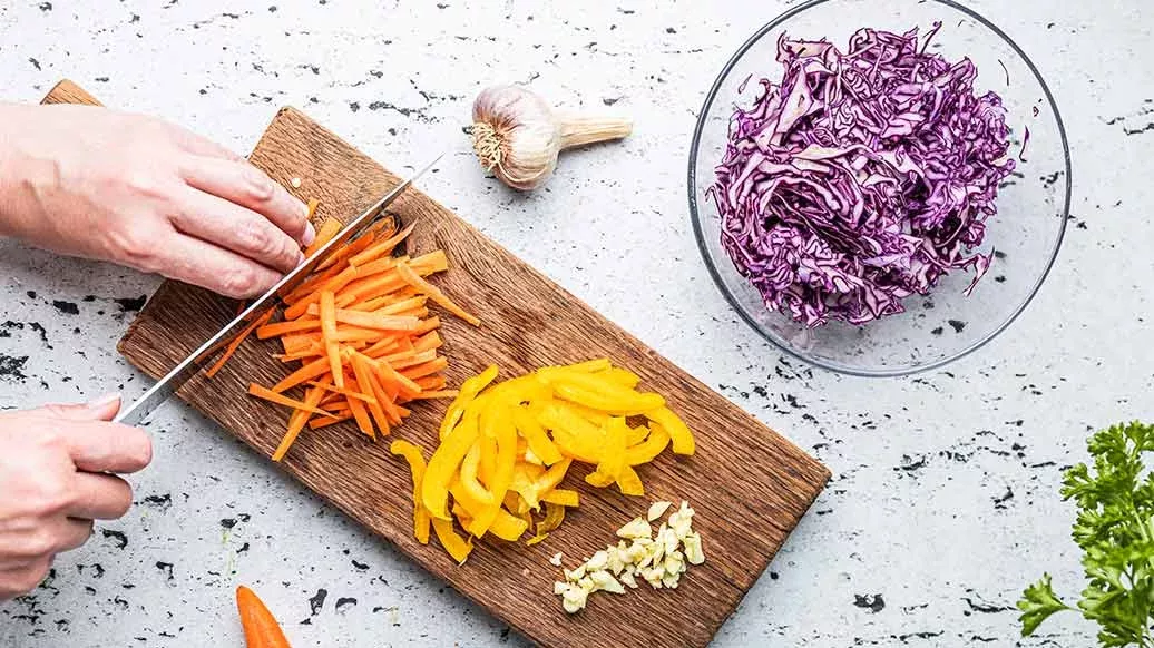 Lava le verdure e taglia le carote, i peperoni e il cavolo rosso in striscioline sottili.