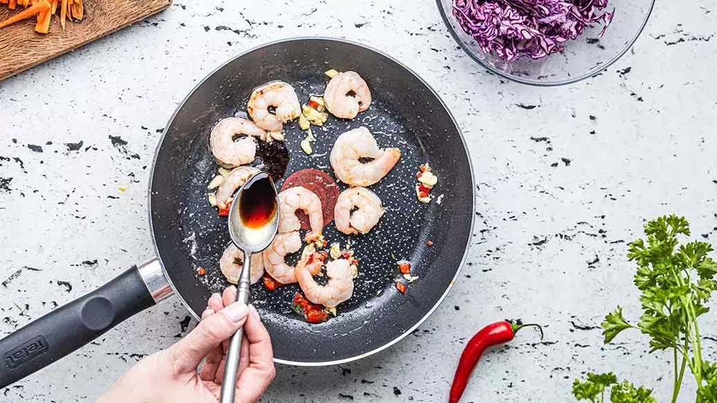 Per una versione vegana, sostituisci i gamberetti con tofu tagliato a dadini e avvolgerlo con le verdure dopo averlo fatto soffriggere.