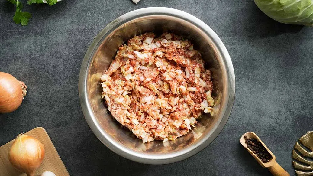 250 g di carne macinata – 250 g di cavolo, tagliato a cubetti da 1 cm – ½ cipolla, tagliata a cubetti da 1 cm – 6 cucchiai Panko Kikkoman - Pangrattato in Stile Giapponese – 2 uova – 2 cucchiai Salsa di Soia a Fermentazione Naturale Kikkoman – 1 cucchiaino di pepe