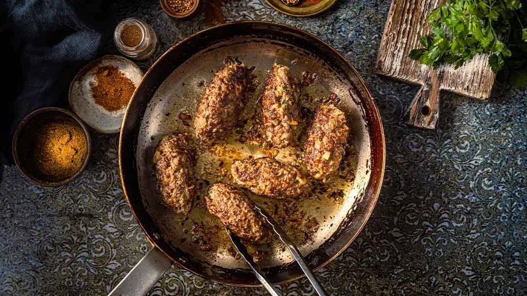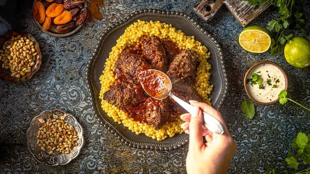 Lasciati trasportare dai profumi del Medio Oriente con queste kofta di manzo speziate con cannella, cumino ed erbe fresche. Vengono cotte a fuoco lento in una salsa di pomodoro acidula al lime e servite con couscous, yogurt e pinoli. Un piatto avvolgente e dal carattere mediorientale.