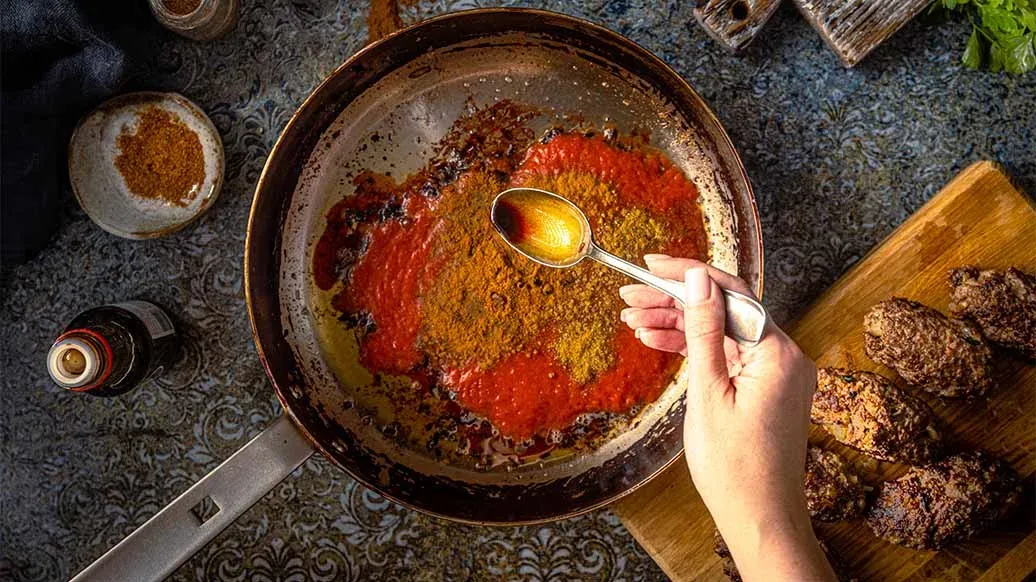 Togli le kofta dalla padella. Versa la passata di pomodoro nella stessa padella, insieme ai succhi di cottura. Aggiungi la cannella, il cumino, il peperoncino in polvere e la Salsa di Soia Kikkoman. Copri e lascia sobbollire per circa 15 minuti.