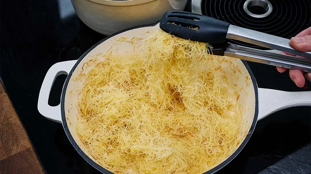 Fondi il burro, poi mescolalo accuratamente con la pasta kataifi sfilacciata finché non sarà uniformemente ricoperta.