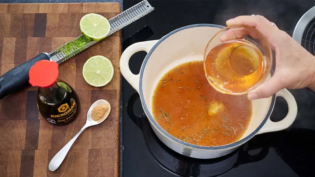 Grattugia finemente un po' di scorza di lime, poi taglialo a metà e spremilo per ottenere il succo. Metti la scorza e il succo in un pentolino con il miele, la Salsa di Soia Kikkoman, la cannella e circa 75 ml d'acqua. Lascia sobbollire dolcemente per 3-5 minuti, poi aggiungi l'acqua di rose, se vuoi utilizzarla.
