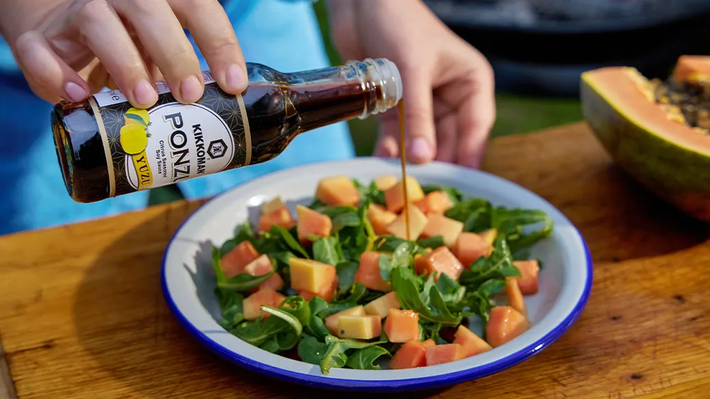 200 g di papaya – 60 g di rucola – 40 ml Kikkoman Ponzu - miscela di salsa di soia, aceto e succo di yuzu