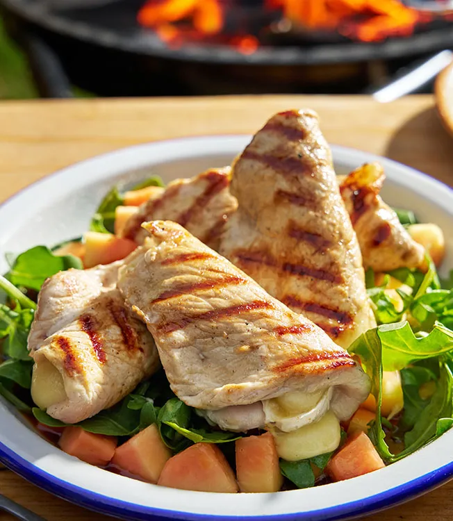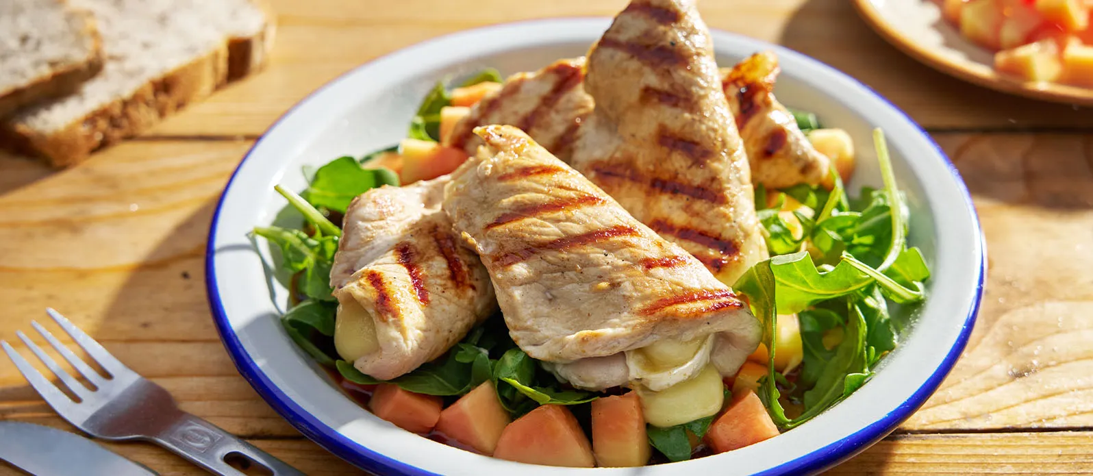 Fette succose di lonza di maiale farcite con brie cremoso, servite su un’insalata di papaya e rucola. Il tutto viene poi condito con Salsa Ponzu Kikkoman – Yuzu, per un tocco umami in più.