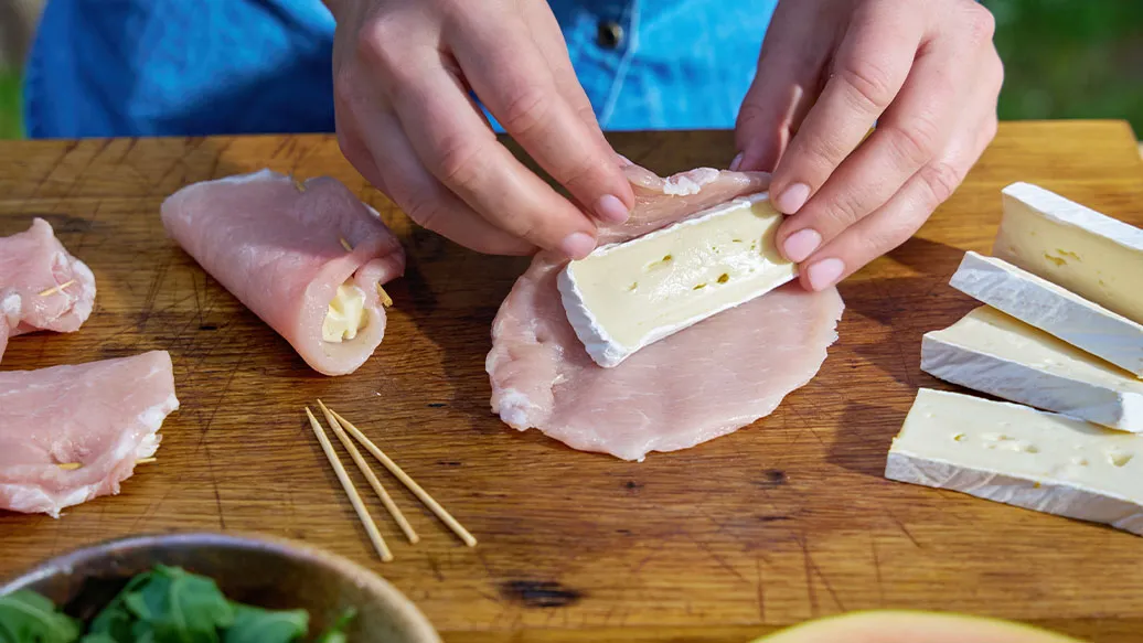 Battere le fette di lonza, mettere un po’ di brie al centro, piegare a forma di tasca e fissare con uno stuzzicadenti.