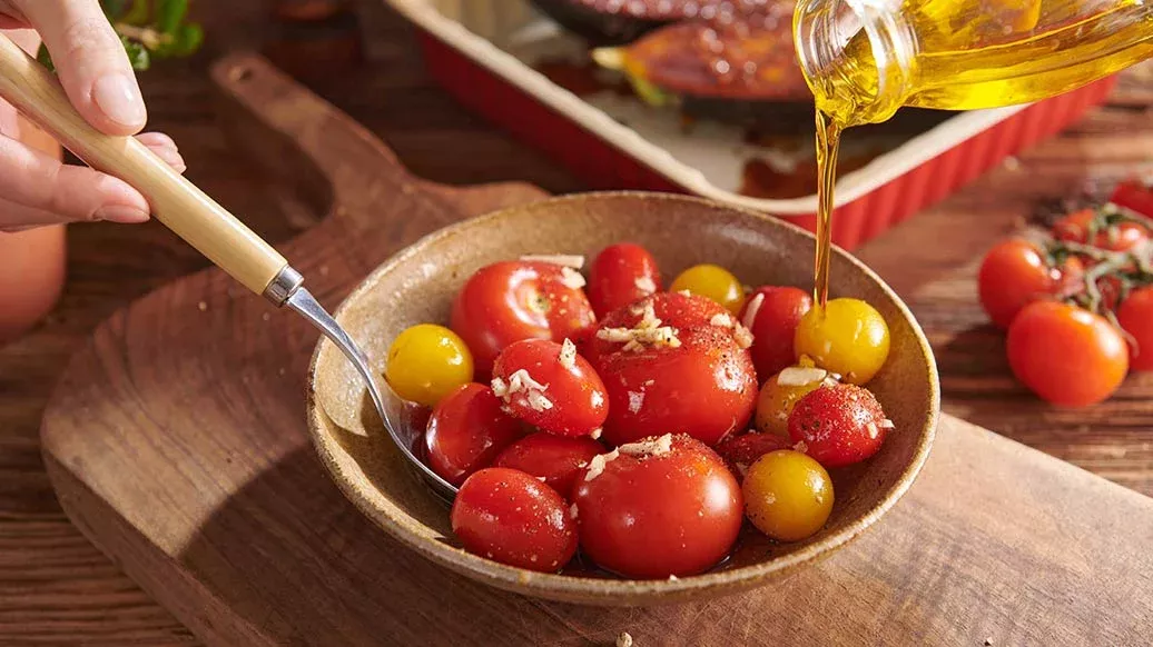 Mescolare i pomodorini con l'olio d'oliva e l'aceto balsamico. Aggiungere l'aglio tritato, il sale e il pepe, quindi mescolare bene.