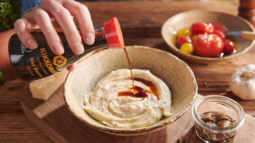 Mescolare la maionese con la pasta al tartufo, la salsa di soia Kikkoman, la panna acida e il parmigiano grattugiato. Aggiustare di sale, pepe e miele e mescolare fino a ottenere un composto omogeneo.