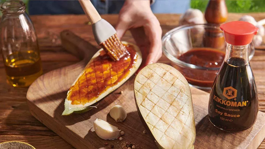 1 melanzana di medie dimensioni – 2 spicchi d'aglio – 1 cucchiaio di pasta di tamarindo – 4 cucchiai Salsa di Soia a Fermentazione Naturale Kikkoman – 2 cucchiai di ketchup – ½ cucchiaino di coriandolo in polvere – 1 pizzico di pepe – 2 cucchiai di olio d'oliva