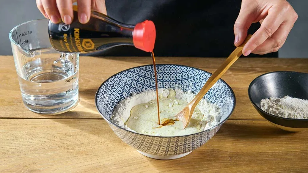 150 g di tempura – 150 ml di acqua frizzante – 40 ml Salsa di Soia a Fermentazione Naturale Kikkoman