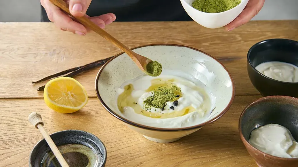 100 g di yogurt naturale – 100 g di panna acida – 1 cucchiaino di tè matcha – 1 cucchiaio di succo di limone – 1 cucchiaino di essenza di vaniglia – 1 cucchiaio di miele