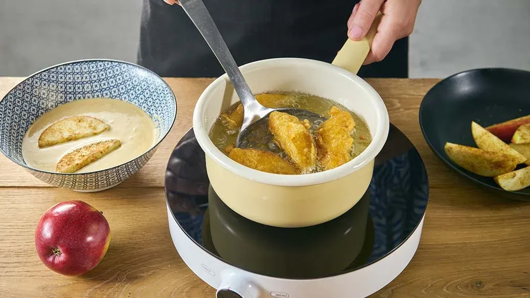 Sbuccia le mele, tagliale in 8 pezzi e cospargile con le spezie. Ricoprile con la pastella preparata nel passaggio 1 e friggile in olio caldo per 3-5 minuti fino a doratura. Servi i pezzi di mela fritti con la salsa in una ciotola a parte.