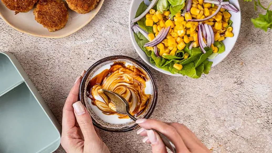 Affetta finemente la cipolla rossa e mescolala in una ciotola con la lattuga e il mais dolce in scatola. Mescola lo yogurt con la Salsa di Soia Kikkoman per creare un condimento semplice, poi aggiungilo all'insalata e mescola bene. Taglia le uova in quarti e disponile sopra l'insalata. Servi i medaglioni con l'insalata.