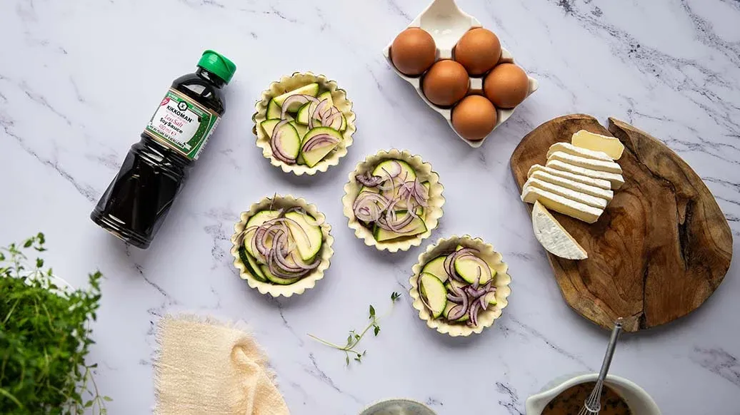 Queste tortine monoporzione con camembert, zucchine e cipolla rossa acquistano una profondità extra grazie a un tocco di Salsa di Soia Kikkoman. Sono saporite e facili da trasportare ovunque tu voglia con un pratico portapranzo, sia calde che fredde.