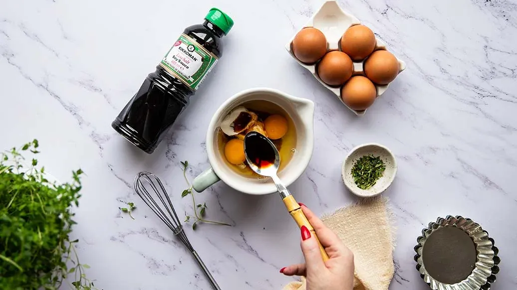 Sbatti le uova con lo yogurt greco, la Salsa di Soia a Basso Contenuto di Sale Kikkoman, la sriracha e il timo.