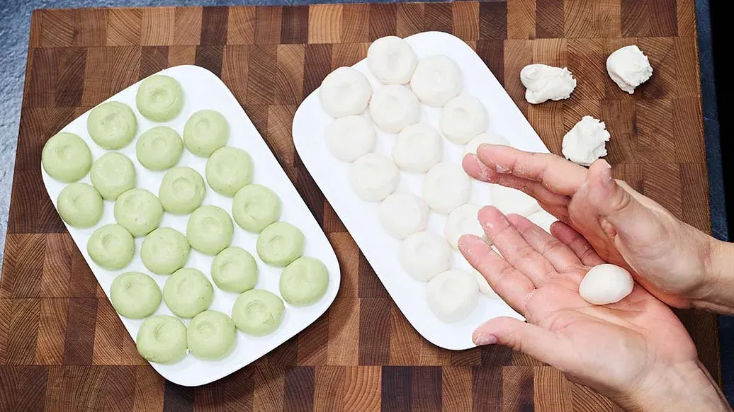 Asciuga molto bene il tofu e mescolalo accuratamente con la farina di riso, lo zucchero e lo zucchero vanigliato. Dividi l’impasto in due parti e incorpora il matcha in una delle due porzioni.