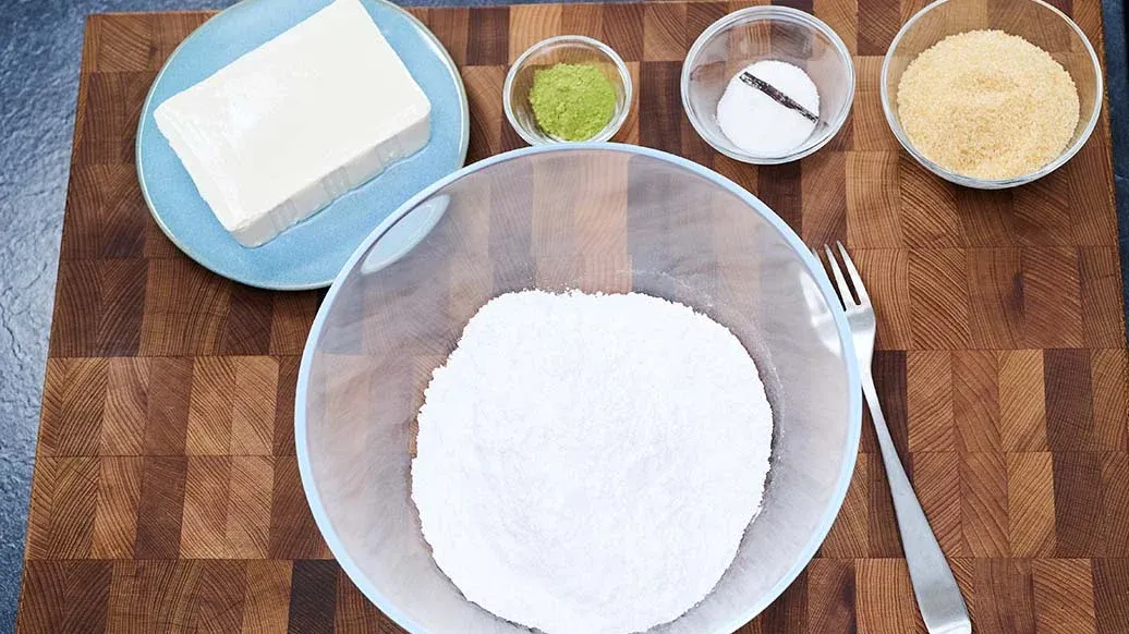 200 g di tofu morbido – 200 g di farina di riso – 3 cucchiai di zucchero di canna – 2 cucchiaini di zucchero vanigliato al Bourbon – 1 cucchiaino di matcha in polvere