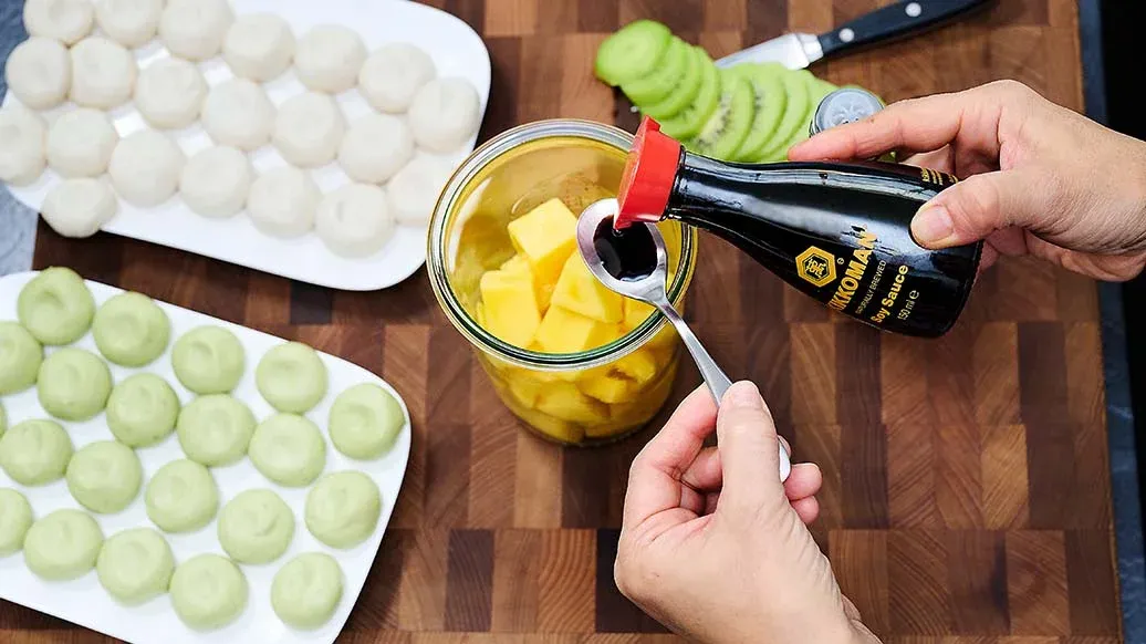 400 g di polpa di mango – 4 cucchiaini Salsa di Soia a Fermentazione Naturale Kikkoman – 2 cucchiaini Condimento Dolce da Cucina in Stile Mirin Kikkoman – 2 kiwi verdi