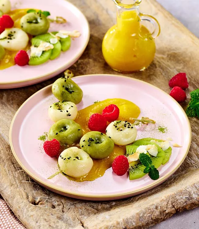 Quando i mochi sono cotti, scolali, raffreddali brevemente in acqua fredda o ghiacciata e asciugali bene. Servili nei piatti con la salsa al mango e guarnisci con il kiwi, la menta, un po’ di matcha in polvere, i semi di sesamo nero, le scaglie di cocco e i lamponi.